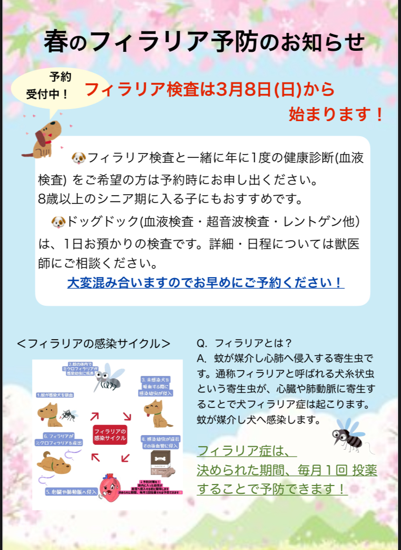 今年は3月8日(日)からフィラリア検査を開始します。完全予約制となりますので、お電話にてご予約をお願いします。